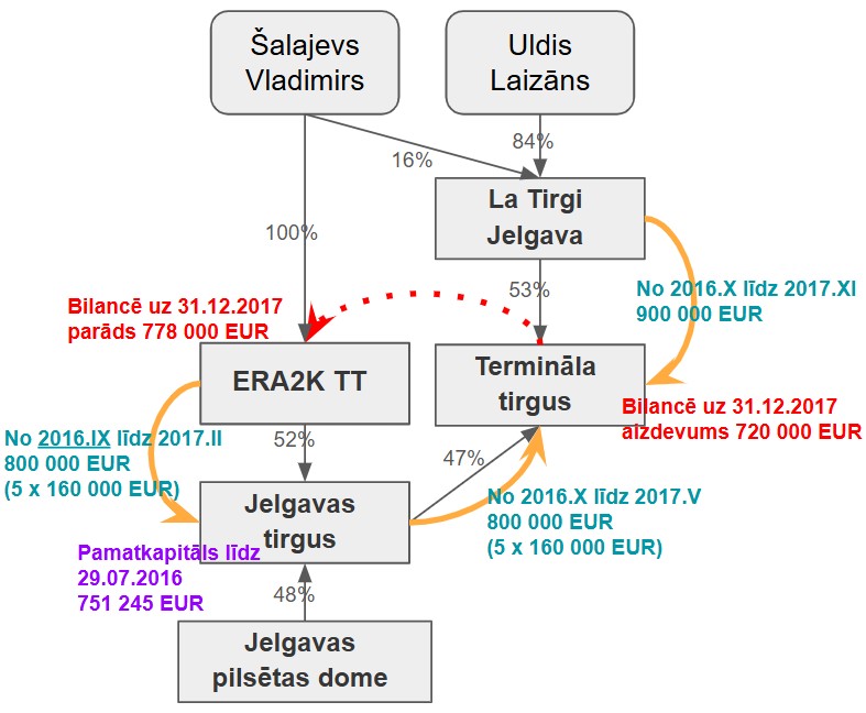 Dibinot Termināla tirgus, SIA, 2016. gada 5. oktobrī JT noslēdza līgumu ar La Tirgi Jelgava, nosakot, ka JT pamatkapitālā jāiemaksā 800 000 eiro 7 mēnešu laikā un La Tirgi Jelgava jāiemaksā 900 000 eiro 13 mēnešu laikā. Apskatot Termināla tirgus gada pārskatu (05.10.2016-31.12.2017) redzam, ka parādās neiemaksātās daļas sabiedrības kapitālā 720 000 eiro vērtībā, lai gan minētie termiņi līdz 2017. gada beigām jau bija pagājuši. Apskatot ERA2K TT, SIA gada pārskatu (15.07.2016.-31.12.2017.) redzam, ka uzņēmuma saistībās parādās ilgtermiņa aizņēmums 777 927 eiro apmērā. Diemžēl ar publiski pieejamo informāciju nav iespējams pierādīt, kā aplis noslēdzas ar pārskaitījumiem no Termināla tirgus, SIA uz ERA2K TT, SIA, bet ceram, ka tas ir darbs, ko paveikuši izmeklētāji, lai pierādītu šo shēmu tiesā.