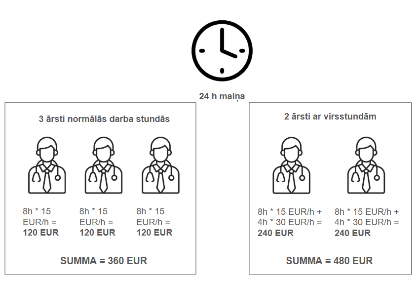 Ilustrācijai teorētisks piemērs: Slimnīca algo 3 speciālistus 24h nosegšanai ar parastu atalgojumu (bez virsstundām), pieņemot teorētiskus 15 EUR/h sanāk 360 EUR/24h. Ja slimnīcai iztrūkst 1 speciālists, tad ar 2 darbiniekiem nosegt dienu izmaksās jau atlikušie 480 EUR, jo 8 stundas šajā dienā tiek apmaksātas dubultā.