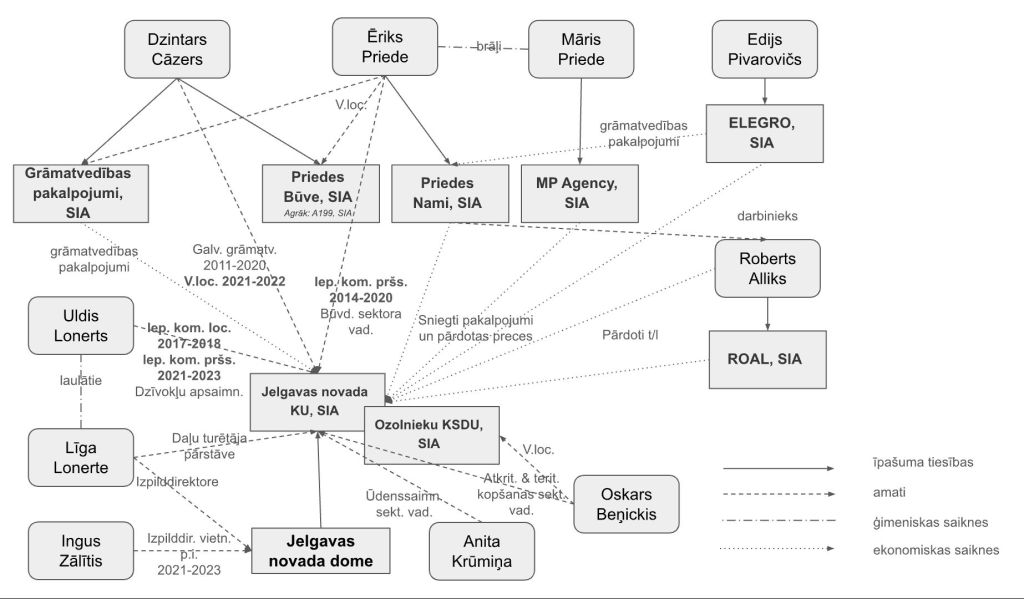 Dalības (nepārtrauktas līnijas) un amati (pārtrauktas līnijas) uzņēmumos saskaņā ar Uzņēmumu reģistra datiem. Gadījumā, kad personai ir gan dalība uzņēmumā, gan amats, norādīta tikai dalība. Likvidēti/reorganizēti uzņēmumi ar pārtrauktu kontūru. Vēsturiskā dalība, amati slīprakstā. Radniecības un citas partnerības (punktotās līnijas) norādītas balstoties uz publiski neapstiprinātu informāciju.